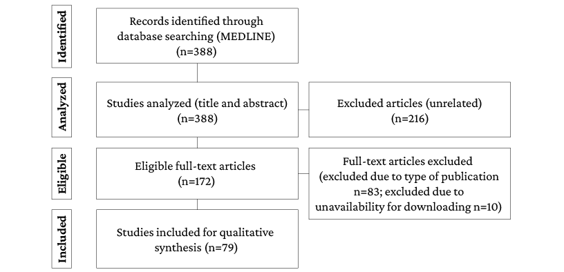 The initial search yielded 388 records, of which 216 were excluded during the title and abstract review stage because they did not address the topic of interest for the study: 10 were excluded during the full-text reading stage because of full text unavailability and 83 were excluded because of the type of study, resulting in the inclusion of 79 studies for full analysis. The search and article selection flowchart is presented in Figure 1.