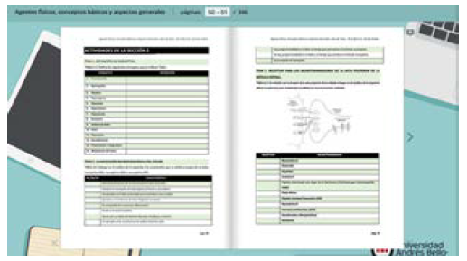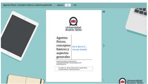 Taking this into account, the objective of this paper is to describe, through a descriptive cross-sectional design, the design, review, digitalization and implementation phases of a digital textbook about physical agents as a learning resource to support distance learning in the training process of physical therapy students enrolled in the physical agents course offered by Universidad Andrés Bello (Santiago, Chile) in the context of the human mobility restriction measures implemented due to the COVID-19 pandemic.