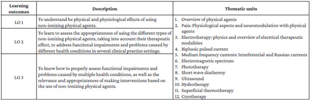 Table 1: Learning outcomes of the physical agents course and thematic units of the textbook.