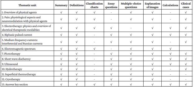Each thematic unit of the digital textbook was structured in two parts: a summary section and a worksheets section (Table 2).61 The summary section consisted of a general description of each topic included in the unit and where the key concepts of the contents discussed in the unit, as well as the contraindications and risks of each physical agent were highlighted. The worksheets section consisted of several self-study activities such as definitions, multiple-choice questions, interpretation and analysis of images, and development of clinical cases.61 Likewise, the complexity of the contents in each section increased according to the cognitive level of the LO to be achieved.