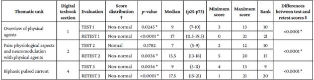 Table 3: Comparison between the scores obtained by the students in the test and retests (thematic units 1, 2 and 4).