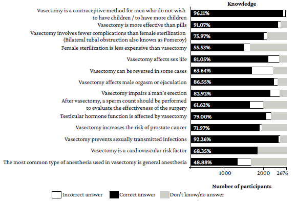 On the other hand, in the present study it was found that the participants had large gaps in knowledge regarding the type of anesthesia used in the procedure and its costs compared to tubal ligation, as such questions were answered correctly by only 48.88% and 55.53% of the participants, respectively. This is in agreement with Torrado-Arenas et al., 8 who reported, in a study in 112 medical students in Colombia, that 49.10% of the participants did not know what the difference between the costs of vasectomy and tubal ligation was, and most were unclear about the type of anesthesia used in the procedure.