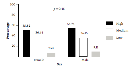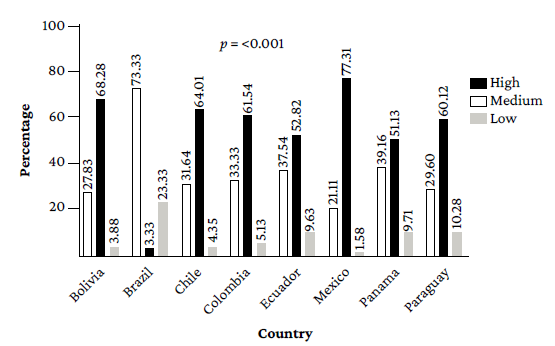 No significant difference was found in terms of participants' level of knowledge by sex (p=0.45) (Figure 2); however, significant differences were observed by country of origin (p<0.00l): most students in Mexico and Bolivia had a high level of knowledge (77.31% and 68.28%, respectively), while in Brazil only 3.33% had a high level of knowledge (Figure 3).