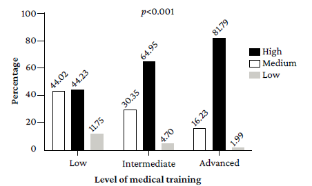 Significant differences were also found in the level of general knowledge about vasectomy among students depending on their level of medical training (p<0.001), as the percentage of students at advanced levels who demonstrated high knowledge about the procedure was higher (81.79%) than those at basic levels (44.02%) (Figure 4).