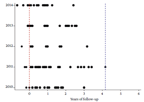 Figure 2: Distribution of research publication during a six-year follow-up period. The red line indicates the moment when the National Scientific Congress was held. Note that some points are located before the red line, indicating that the study was published before submission to the NSC. The blue line indicates the maximum time of 4.2 years until publication of the research paper in a scientific journal.