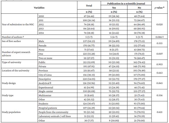 The year with the highest number of abstracts submitted to the NSC was 2011 (26.54%). The median number of authors per research paper was 5 (IQR: 3-7) and the percentage of papers in which the first author was male was slightly higher (58.23%). One or more advisors with research experience participated in 82.55% of the papers, and 61.67% of the authors came from a university outside Lima. Descriptive design and student population were the most frequent study design and population (54.05% and 30.47%); moreover, most studies were single-center (81.08%) (Table 1). During the study period, 97 papers were published, i.e., 23.83% (95%CI: 19.93%-28.23%) of the total number of papers submitted to the NSCs held between 2010 and 2014.