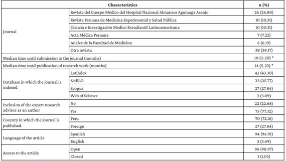 Regarding the characteristics of the 97 studies that were published, it was found that 96.91%, 72.16% and 43.30% were published in Spanish, in Peruvian journals, and in journals indexed in Latindex, respectively, and that the Revista del Cuerpo Médico del Hospital Nacional Almanzor Aguinaga Asenjo was the journal in which the largest number of these papers were published (26.80%). In addition, the advisor or advisors with research experience were included as an author in 77.32%, and the median time from submission to the congress until the article was submitted to the journal and until its publication was 10 (IQR: 2-20) and 14 months (IQR: 5-23) (Table 3).