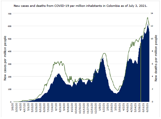 Figure 1: New cases and new deaths per million people due to COVID-19 in Colombia as of July 3, 2021. Note: the yellow vertical line indicates the moment of implementation of the Municipal Epidemiological Resilience Index proposed by the Colombian Ministry of Health and Protection.