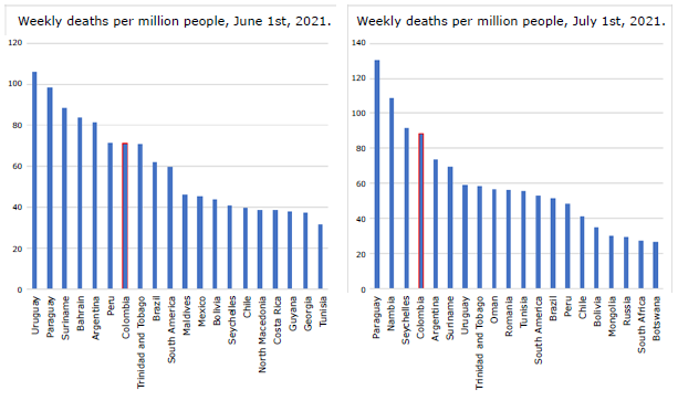 Figure 1 shows the rates of new cases and new deaths per million people before and after the implementation of the IREM, which allow us to confront the statement of Rojas-Botero et al.1 Although it is not possible to speak of a causal relationship between the implementation of this index and the increase in the number of positive cases and deaths due to COVID-19, it is clear that the timing of implementation was not the best in terms of new cases and new deaths, as we noted in our article.2 Moreover, it is clear that this situation continued to worsen until the end of the evaluated period. Furthermore, it is important to mention that Colombia went from being the seventh country with the highest incidence of deaths per million inhabitants on June 1, 2021, to being the fourth on July 1, 2021 (Figure 2).