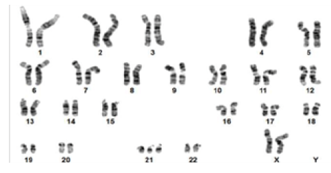 Figure 1: Patient 1. Karyotype with G-banding, 47,XX,+21, typical of Down syndrome.