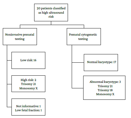 Prospective pilot study conducted between September 2019 and December 2020 in 20 pregnant patients classified as high risk of aneuploidy based on ultrasound findings and treated in Bogotá and Medellín, Colombia. Each patient underwent a confirmatory invasive test (karyotyping) and a NIPT and an invasive confirmatory test (prenatal karyotyping). Concordance between both methods was determined using Cohen's kappa coefficient (significance level p<0.05), where values >0.7 were considered as a good level of agreement.