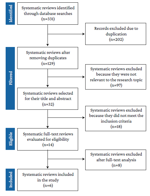 The initial search yielded 331 results, of which 202 were eliminated because they were duplicates, 97 because they did not address the research topic, 18 because they did not meet the inclusion criteria, and 8 because they were not considered relevant to the research objective, so 6 SRs were finally included (Figure 1).