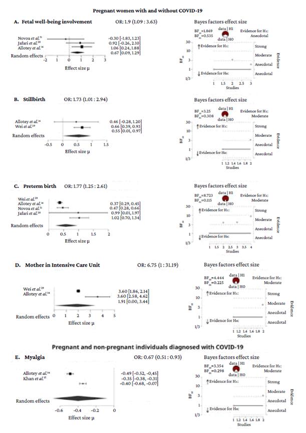 When the outcomes across the groups studied in each SR were analyzed, it was found that most of the quality of the evidence appears to be moderate or high (Tables 2 to 6). However, the results that could be generalized to the population of pregnant women are those obtained through Bayesian meta-analyses (Figure 2): stillbirth: OR=1.73 (95%CI: 1.01-2.94); preterm birth: OR=1.77 (95%CI: 1.25-2.61); maternal admission to the ICU: OR=6.75 (95%CI: 1-31.19) and fetal welfare involvement: OR=1.9 (IC95%: 1.09-3.63) for pregnant women with and without COVID-19 (although the evidence in favor of H1 is anecdotal for the latter); and myalgia: OR=0.67 (95%CI: 0.51-0.93) for pregnant and non-pregnant women with COVID-19.