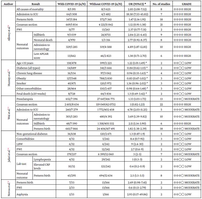 Se recuperaron 6 revisiones sistemáticas (para un total de 617 estudios primarios). Se realizó una síntesis narrativa de las proporciones de los signos, síntomas y hallazgos imagenológicos y de laboratorio tanto de las madres, como de los neonatos. Las Odds ratio (OR) entre las embarazadas con y sin COVID-19 fueron: compromiso del bienestar fetal: 1.9 (IC95%:1.09-3.63), mortinato: 1.73 (IC95%:1.01-2.94), nacimiento prematuro: 1.77 (IC95%:1.25-2.61) y admisión de la madre a unidad de cuidados intensivos (UCI): 6.75 (IC95%: 1-31.19). Con relación a la sintomatología: la OR para la mialgia entre las embarazadas y las no embarazadas con COVID-19 fue 0.67 (IC95%:0.51-0.93).