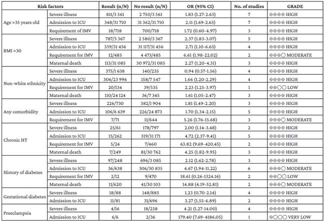 Allotey et al. 14 studied the association between some risk factors or comorbidities and the possibility of presenting severe COVID-19 disease, admission to the ICU, invasive mechanical ventilation (IMV) or maternal death; the details of these results are presented in Table 4.
