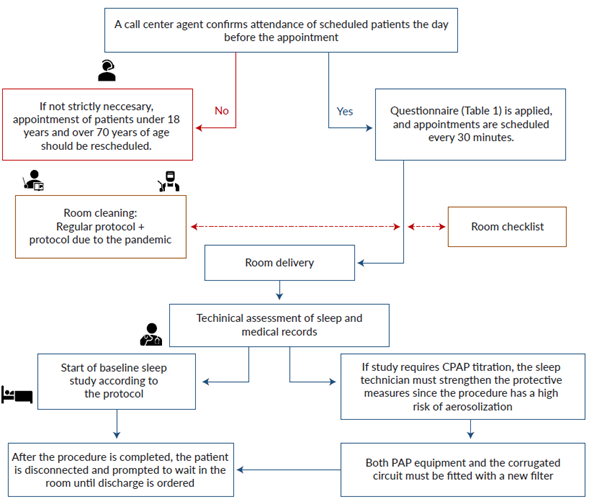 Patients who are scheduled for sleep studies should be asked by telephone about symptoms and risk factors when confirming assistance to the procedure. If they have symptoms or if they have had contact with someone diagnosed with COVID-19, they will be rescheduled and will be informed about preventive isolation measures, hygiene standards and the hotline enabled to follow-up suspected cases (Table 1, Figure 1).
