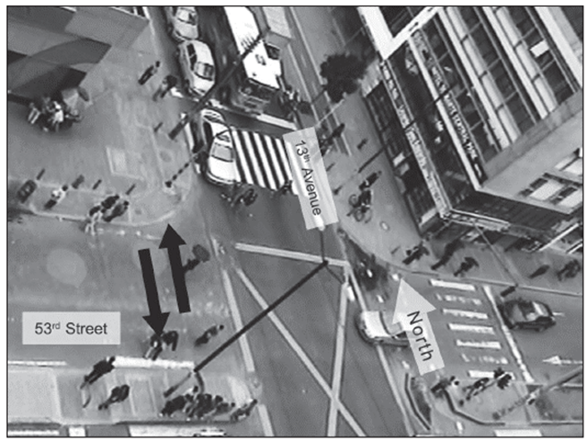Data collection was done through videotaping pedestrians as they crossed a selected road (Figure 1). An audio video interleave format (AVI) video was taken from a tall building that was adjacent to the road of interest. The view scope of the recordings allowed for the analyses of pedestrian crossings at the corner through designated areas (i.e., the crosswalk or pedestrian crossing) and up to approximately 30 meters from the corner. The video recording angle and distance did not allow to positively identifying specific pedestrians; therefore, it was not possible to describe the demographics of observed pedestrians. Letters requesting permission to place video recording equipment on an upper level of buildings were sent to their administrators. The present study reports the results obtained from videos taken at the corner of 53rd street and 11th avenue in Bogotá, Colombia. Standard SONY camcorder DCR SR82 equipment was used.