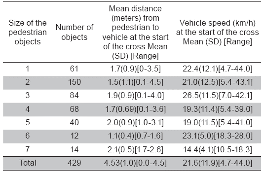 Table 1: Recorded pedestrian-vehicle distance and vehicle speeds by size of the pedestrian object