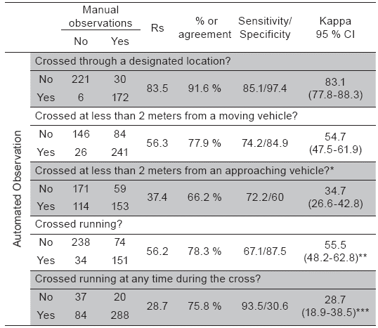 Among those pedestrians that were detected by the algorithm, the agreement between visual and automated observations was at least moderate depending on the assessed behavior and the measure of agreement that was used (Table 2). In general, the percentage of agreement and the sensitivity and specificity measures showed good agreement between both methods. In contrast, for the observation of whether pedestrians cross at 2 meters or less from a moving approaching vehicle or not and the observation of whether pedestrians cross running at any time during the cross or not (for example if the pedestrian starts the cross walking and then starts running), low correlations were found (28.7-37.4), as well as only fair agreement by using Cohen’s Kappa according to the criteria proposed by Landis & Koch 35.