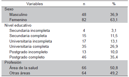 Se encuestaron 130 funcionarios, cuyas características se muestran en la Tabla 1. Del total de encuestados, 51 (39,2 %) indicaron que participaban tanto en la producción como en el uso de la información, 49 (37,7 %) únicamente lo hacían en la producción y 30 (23,1 %) sólo en el uso.