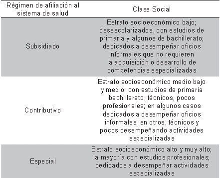 Esta categoría se operativizó clasificando los informantes por: nivel educativo, oficio desempeñado y recurso económico; no se indagó por el monto ingresos recibidos, sino que por sus relatos se estableció si representaban una limitante o una posibilidad de acoger las prescripciones médicas. La clase social fue asociada al régimen de salud al que pertenecían; de acuerdo a las semejanzas en el discurso, estas posiciones coincidieron con los regímenes desde donde se habían seleccionado, (Tabla 1).