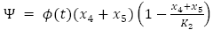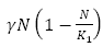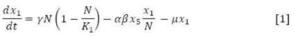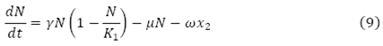 En la EDO (9), se observa el cambio de la población total humana con respecto al tiempo, dado, por un flujo de crecimiento logístico , menos un flujo del total de personas que mueren por causa natural µN y el flujo de personas infecciosas que mueren a causa de la enfermedad