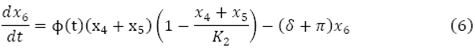 En esta ecuación diferencial indica la población de pupas que mueren por causas naturales y que se desarrollan al estado de mosquito adulto.