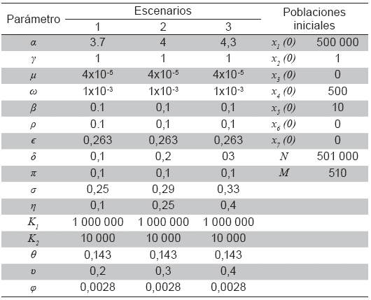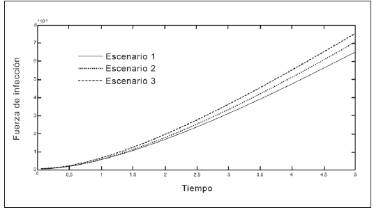 En las Tablas 1 y 2 se presentan los valores de los parámetros que intervienen en la fuerza de infección. En las Figuras 2 a 5 se observa que la fuerza de infección aumenta de acuerdo a los diferentes escenarios y en el tiempo, es decir, la tasa de nuevos casos crece, mostrando la necesidad de prevención en las personas, mediante el uso de telas metálicas, mosquiteros, repelentes, ropa adecuada entre otras medidas; control químico como larvicidas y adulticidas contra el vector, como también la eliminación de criaderos que interrumpan su ciclo de vida. También es importante tomar medidas con las personas infectadas, debido a que si tratan de manera adecuada, se reduce la transmisión del virus.