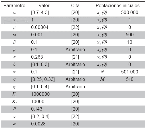 : población promedio de mosquitos maduros en un tiempo t,θ: tasa de recuperación de las personas infectadas, δ: tasa de huevos que se desarrollan a larvas, П tasa de eliminación de huevos por factores del ambiente, σ tasa de muerte de larvas por causas ambientales, η: tasa de muerte de pupas por causas ambientales, υ: tasa de larvas que se desarrollan a pupas, φ tasa de ovoposición dependiente del tiempo y periódica, ξ amplitud de oscilación estacional en la tasa de reproducción de los mosquitos,