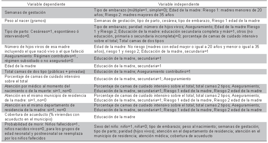 No se incluyeron en el modelo: 1) las variables con alta correlación entre sí como el área rural y las madres solas, correlacionados con el nivel de educación secundaria de la madre; 2) el coeficiente de correlación (CC) de la razón de camas privadas por 1 000 NV fue casi igual a la razón de camas de unidad de cuidado intensivo por 1 000 NV; 3) en el modelo se incluyó un solo efecto sobre el tipo de parto por cesárea, desde las variables de disponibilidad de servicios de salud, por tener una correlación significativa.