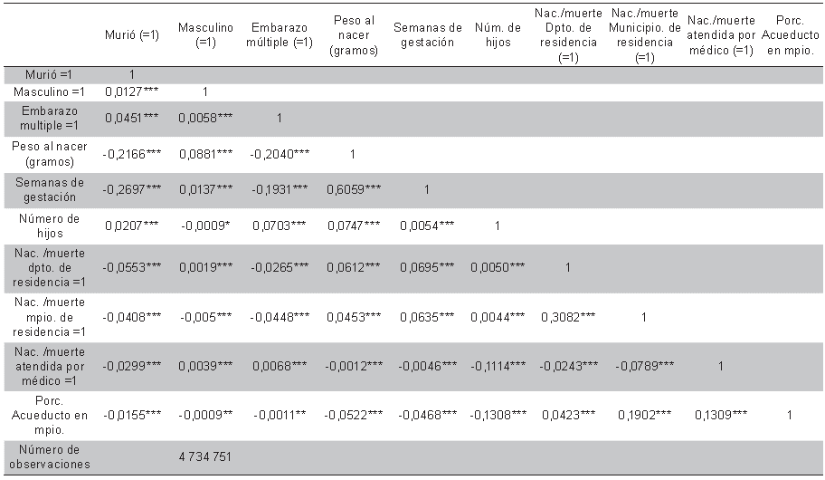 La base de datos procede de las estadísticas vitales (EEVV) 2003 a 2009 del Departamento Administrativo Nacional de Estadística (DANE) que contiene a) 77 451 registros individuales de defunción de niños fallecidos menores de un año; b) 4 991 724 registros individuales de nacidos vivos (NV) y; c) Disponibilidad anual en cada municipio de camas públicas y privadas materno-infantiles y de cuidado intensivo neonatal y pediátrico, procedentes del Registro Especial de Prestadores de Servicios de Salud (REPS) 18. Los registros contienen variables biológicas de la madre y del niño, variables socioeconómicas y culturales (educación de la madre - tipo de aseguramiento) y uso de los servicios de salud.