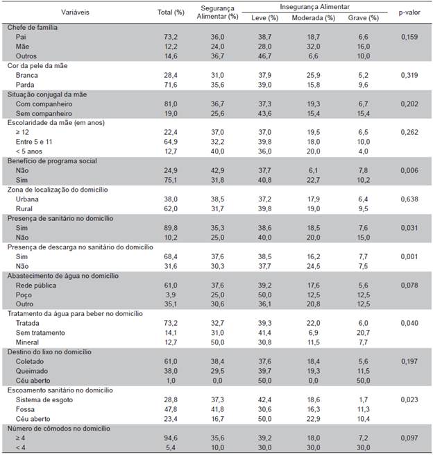 A mãe como chefe de família foi registrada em 12,2 % dos domicílios, enquanto 81 % das mães referiram viver com companheiro. A maioria delas declarou-se de cor parda (71,6 %) e 12,7 % possuíam baixa escolaridade (<5 anos de estudo). Quanto às condições de saneamento básico, verificou-se que 39 % dos domicílios não estavam ligados à rede pública de abastecimento de água, 71,2 % não tinham acesso a tratamento público de esgoto e 14,1 % não possuíam água tratada/mineral para consumo individual. Maiores prevalências de insegurança alimentar foram encontradas nas famílias beneficiárias de programa social, que não dispunham de sanitário no domicílio, que não tinham descarga no sanitário, que bebiam água não tratada e que não dispunham de sistema de esgoto domiciliar. Para os beneficiários de programa social, a percepção foi marcadamente mais evidente para a insegurança alimentar moderada, que teve prevalência 3,72 vezes mais elevada no grupo de famílias que recebiam o auxílio (22,7% versus 6,1 %) (Tabela 1).