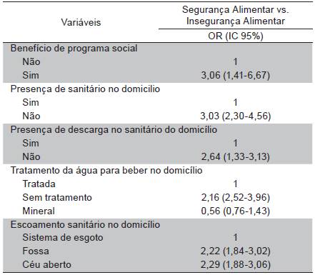 No modelo de regressão logística multivariada (Tabela 2), observou-se que o benefício do programa social associou-se a uma chance maior do que 3 vezes mais de insegurança alimentar. Ausência de sanitário no domicílio, ausência de descarga no sanitário do domicílio, ausência de sistema de esgoto no domicílio e o consumo de água não tratada permaneceram associadas à insegurança alimentar, com valores de razões de chance entre 2,16 e 3,03. A ausência de saneamento básico associou-se a uma chance maior do que duas vezes mais de insegurança alimentar, referido tanto para o uso de fossa quanto a céu aberto.
