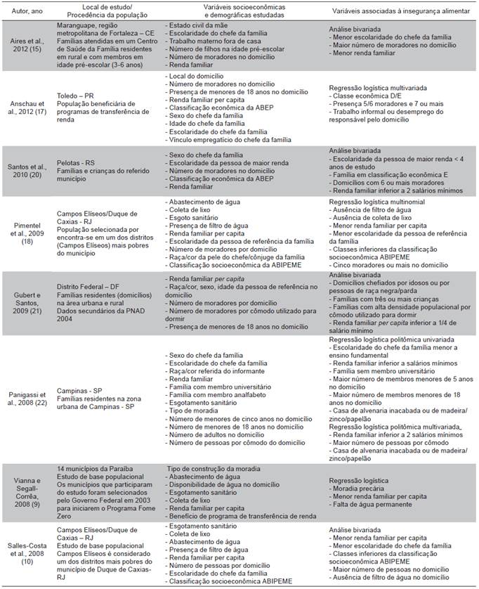 Quadro 1: Características de alguns estudos sobre a situação de (in)segurança alimentar de famílias brasileiras, avaliada pela Escala Brasileira de Insegurança Alimentar, e associação com variáveis socioeconómicas