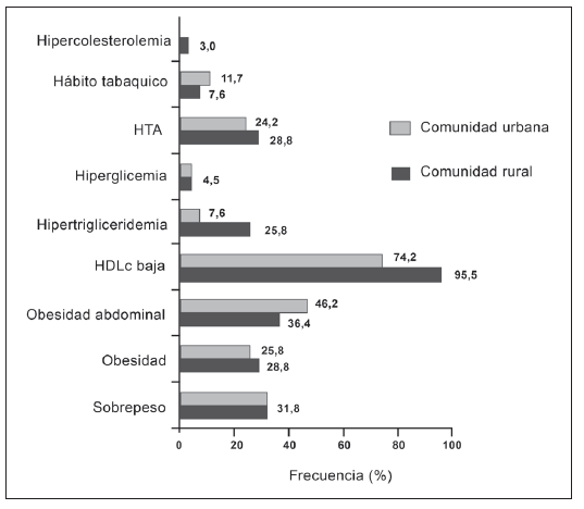 Se evidenció que alrededor del 60 % de los individuos de la comunidad rural presentaron entre obesidad y sobrepeso. Cifras similares fueron obtenidas en la comunidad urbana, no encontrándose diferencias estadísticamente significativas entre ambas. Casi la mitad de los participantes mostró obesidad abdominal, así como una frecuencia importante de individuos con HDLc bajo (mayor al 70 %). Cabe destacar que si bien, se obtuvieron bajos porcentajes de hipertrigliceridemia, los mismos fueron significativamente superiores en la comunidad rural (Chi-cuadrado=4,82; p=0,0281). Caso contrario ocurre con la frecuencia del hábito tabáquico, el cual es estadísticamente superior en la comunidad urbana (Chi-cuadrado=4,48; p=0,0342).