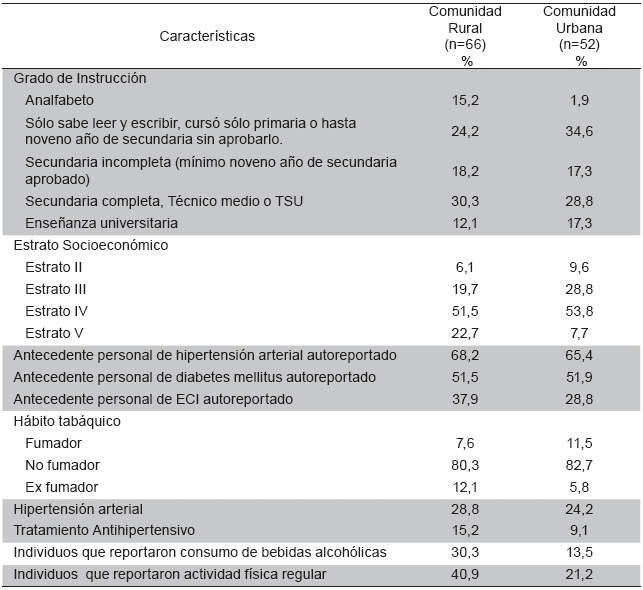 En el caso de la comunidad urbana, la muestra estuvo conformada por individuos ubicados en los estratos socioeconómicos intermedios (III y IV). Se observó un nivel de analfabetismo casi nulo (1,9 %) mucho menor al obtenido en la comunidad rural, además de que el 50 % de los encuestados solamente sabía leer y escribir, cursó sólo primaria o cursó estudios hasta noveno año de secundaria pero sin lograr aprobarlo, mientras que un tercio de la muestra cursó secundaria completa. El porcentaje de individuos con educación universitaria fue similar al obtenido en la comunidad rural, al igual que los antecedentes familiares de enfermedad cardíaca isquémica, diabetes mellitus e hipertensión arterial. La prevalencia de esta última fue ligeramente menor a la de la zona rural (24 %), sin embargo, menos de la mitad de los hipertensos sigue un tratamiento antihipertensivo. De la misma forma, se obtuvo una baja frecuencia de hábito tabáquico y consumo de bebidas alcohólicas; no obstante, el porcentaje de sedentarismo fue mayor al de la zona rural (80 %).