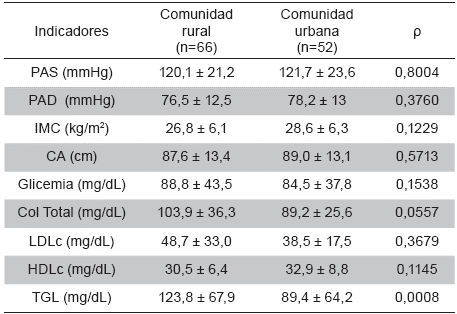 118 individuals older than 18 years (52 of the urban community and 66 of the rural community) were included; their weight, height, waist circumference, blood pressure, blood glucose and lipid profile were assessed. A survey to measure personal history of cardiovascular disease and lifestyle was applied.