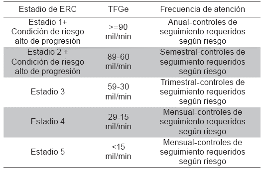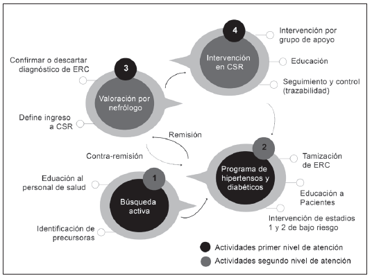 Intervención temprana de los pacientes con ERC en estadios iniciales y/o remisión al segundo nivel de atención: el programa define que los pacientes clasificados en los estadios 1 y 2 de la ERC son intervenidos en el primer nivel de atención, por un equipo conformado por médico general, enfermera, gestor de autocuidado y educador, que en coordinación con el equipo del segundo nivel de atención, de acuerdo a la enfermedad de base y al riesgo de progresión, definen un plan de manejo y unas metas clínicas para el control de la enfermedad. Los pacientes con TFG <60 ml/min y aquellos con TFG mayores pero con factores de alto riesgo de progresión de la ERC son remitidos para continuación del tratamiento en el segundo nivel de atención.