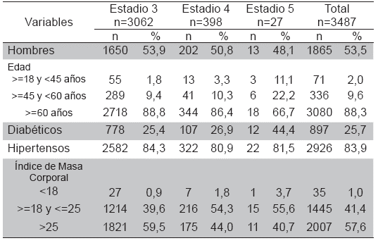 Se describen resultados de 3 487 pacientes que cumplían el criterio de tasa de filtración glomerular estimada (TFGe) <60 mil/min o presencia de marcadores de daño renal. El 87,81 % ingresaron en estadio 3 de la ERC; 53,5 % fueron hombres; la edad promedio al ingreso fue de 71,91 años (DE=10,95 años); las causas de ERC fueron: hipertensión arterial (60,22 %, N=2.114), diabetes (19,24 %, N=671), Glomerulonefritis (2,15 %, N=75) y otras causas (17,98 %, N=627). Se encontraron antecedentes relevantes como enfermedad coronaria en 322 pacientes (9,23 %), insuficiencia cardiaca en 149 (4,27 %) y en 424 (12,15 %) se documentó antecedente familiar de ERC.