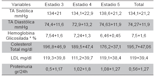 Un total de 2 129 pacientes (61,05 %) ingresaron con tensión arterial sistólica <140 mmHg y 3.091(88,64 %) con tensión arterial diastólica <90mmHg; de 897 diabéticos, 620 tuvieron registro de hemoglobina glicosilada al ingreso, de éstos 357(57,58 %) tuvieron valores <7,5 %. Los valores promedio de los indicadores clínicos al ingreso: tensión arterial sistólica y diastólica, colesterol total, LDL, HbA1c y proteinuria, por estadio de la ERC se presentan en la Tabla 3.