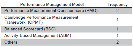 Evidence showed that the most commonly used practice in this sample is Performance Measurement Questionnaire (PMQ), with six different methods of performance management (including BSC) identified, since three entities reported using two practices concomitantly. Whereas information was collected through a self-administered questionnaire, conducting case studies is highly advised to promote the validation of the reported models, in other words, to verify if the practices adopted by institutions, based on the responses provided, match the assumptions presented by the basic performance management model mentioned above.