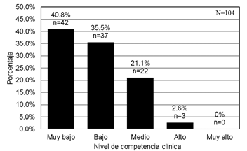 Se encontró que 75 % de los médicos exhibió un nivel muy bajo o bajo de competencia y ninguno mostró un nivel muy alto. En la Figura 1, se presenta la distribución de frecuencias observada en el nivel de competencia clínica para el diagnóstico y manejo de las hepatitis virales.