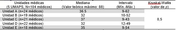 Al comparar el nivel de competencia clínica para el diagnóstico y manejo de las hepatitis virales en los médicos del IGSS según su UMAPS de adscripción, se observó que la mediana de ésta se ubicó en el nivel medio en todas, sin diferencia estadísticamente significativa entre ellas (Kruskal-Wallis, p>0,05). En la Tabla 1, se exponen los estadísticos comparados.