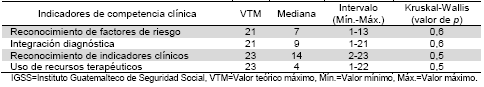 Cross-sectional study in which a previously validated instrument to measure competences was used, and subsequent comparison between physicians at various primary health care units (PHCT) from the Guatemalan Institute of Social Security (GISS). This information was analyzed using descriptive and non-parametrical statistics. 104 physicians, from 5 PHCT ascribed to GISS were analyzed.