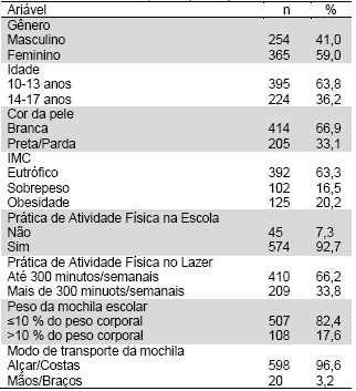 As variáveis independentes analisadas foram: gênero (masculino e feminino); idade (10 a 13 anos e 14 a 17 anos); cor da pele (branco e preto/pardo); IMC/idade obtido por meio dos dados sobre peso, altura, data de nascimento e gênero (eutrófico, sobrepeso e obeso); prática de educação física na escola; prática de atividade física no lazer, aferida por meio do International Physical Activity Questionnaire (IPAQ) (fisicamente ativos adolescentes que referiram realizar de 300 minutos semanais de prática de atividade física no lazer); peso da mochila escolar coletado por meio da pesagem das mochilas no dia de aplicação do questionário (adequado peso da mochila < ou igual a 10 % do peso corporal, e excesso de peso da mochila escolar >10 %) e modo de transporte da mochila (categorizado em alças/costas e mãos/braços). Além disso, foi investigada a presença de dor nas três regiões da coluna vertebral durante e após a caminhada de forma dicotômica (sim/não).