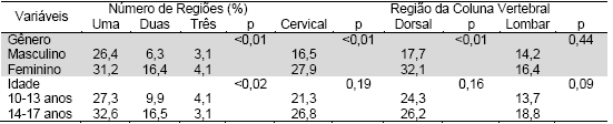 A Tabela 2 também mostra a distribuição da dor na coluna em uma, duas ou três regiões, conforme a idade. Verifica-se maior ocorrência do desfecho em uma ou duas regiões da coluna concomitantemente, em escolares entre 14-17 anos de idade (p=0,02), contudo esta associação não se manteve ao analisarmos as regiões da coluna vertebral separadamente.