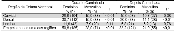 A Tabela 3 mostra que a prevalência de dor em pelo menos um dos segmentos da coluna vertebral é maior entre as adolescentes tanto durante a caminha com a mochila escolar (p<0,01) quanto após a caminhada (p<0,01). Da mesma forma, a ocorrência de dor nas regiões cervical e dorsal durante a caminhada com a mochila escolar é mais frequente no gênero feminino (Tabela 3). As meninas também referem significativamente maior dor na região dorsal (p<0,003) após a caminhada com a mochila escolar.