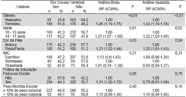 A prevalência do desfecho foi de 45,2 %. Destes, 64,6 % referiram dor em uma região, 27,1 % em duas e 8,3 % em três regiões da coluna. Quando avaliadas separadamente, verificou-se a maior prevalência na região dorsal (26,2 %). Os fatores significantemente associados ao desfecho foram: sexo feminino (RP=1,43; IC95 %=1,19-1,74; p<0,01), idade entre 14 e 17 anos (RP=1,22; IC95 %=1,03-1,45; p=0,02) e cor da pele preta/parda (RP=1,20; IC95 %=1,01-1,43; p=0,04).