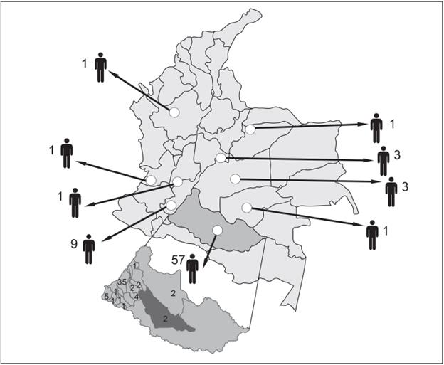 Según los registros electrónicos consultados en las bases de datos de la Registraduría Nacional Colombiana a mayo de 2013, de los 261 donantes reactivos 84,7 % (n=221) eran personas con ciudadanía activa, de estos a 88.2 % (n=195) se les logró obtener una posible ubicación geográfica. En la base de datos del FOSYGA, 75,3 % (147/195) fueron reportados con residencia en Caquetá, seguido del departamento de Huila 9,2 % (n=18), los donantes restantes, 15,4 % (n=30) se distribuyeron en diferentes departamentos del territorio colombiano.