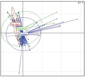 En el análisis de correspondencia múltiple (Figura 2) no se concluyó que existieran variables discriminatorias, sin embargo, estos resultados son producto de sesgo de información en los resultados de las pruebas IFI, ya que el grupo de donantes positivos es 7,9 veces mayor (n=95) que el grupo de donantes negativos (n=12).